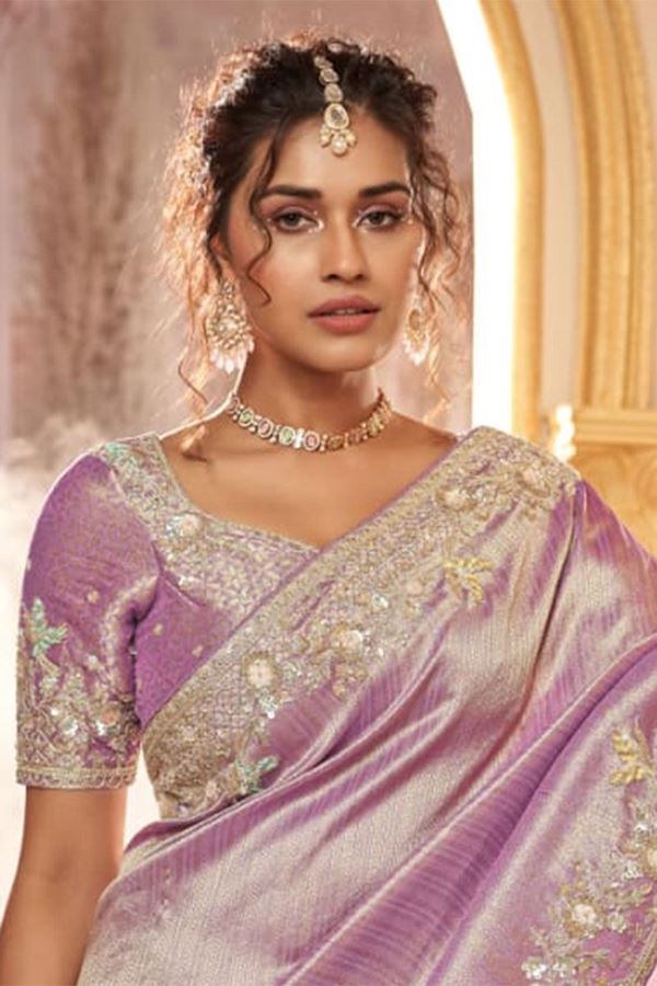 Add more glamour to your style with this beautiful lavender colored designer saree. Buy this saree which is made of organza tissue fabric and is beautifully crafted with sequin and heavy resham embroidery work. Pair this saree with ethnic jewellery and a pair of heels to elevate your style. This saree comes with a matching, silk blouse fabric.